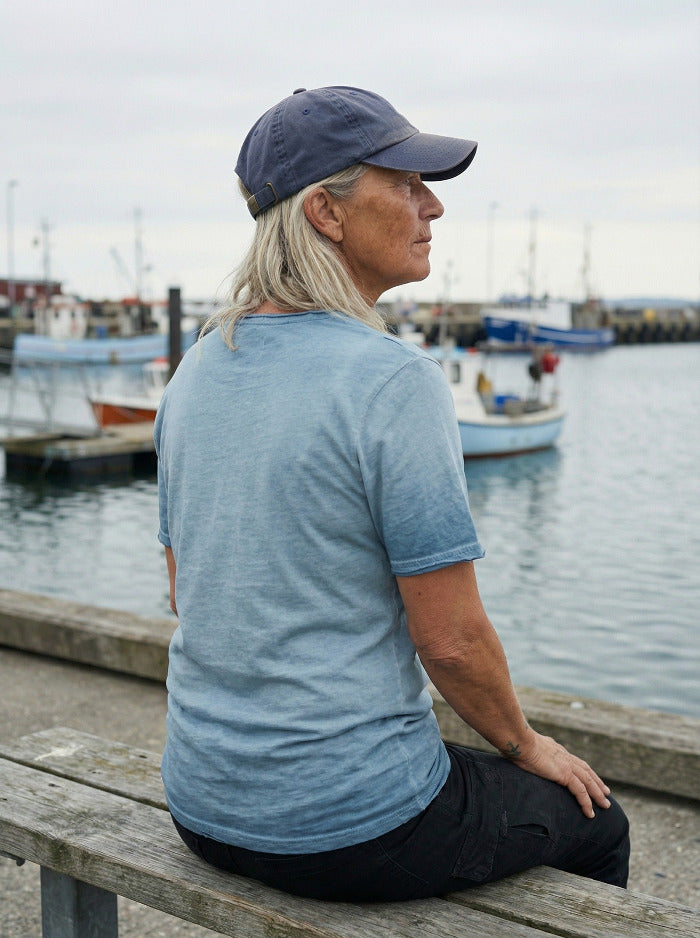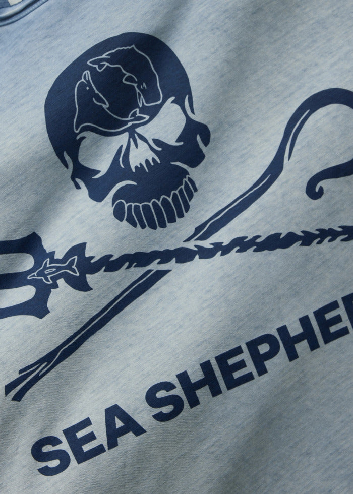 Das T-Shirt hat einen großen Jolly-Roger-Aufdruck auf der Vorderseite und ist aus hochwertiger Bio-Baumwolle gefertigt. Die zarten Blautöne erinnern an die Farben der Antarktis.