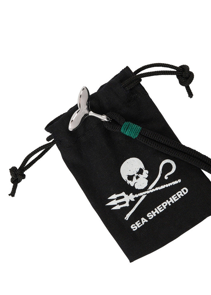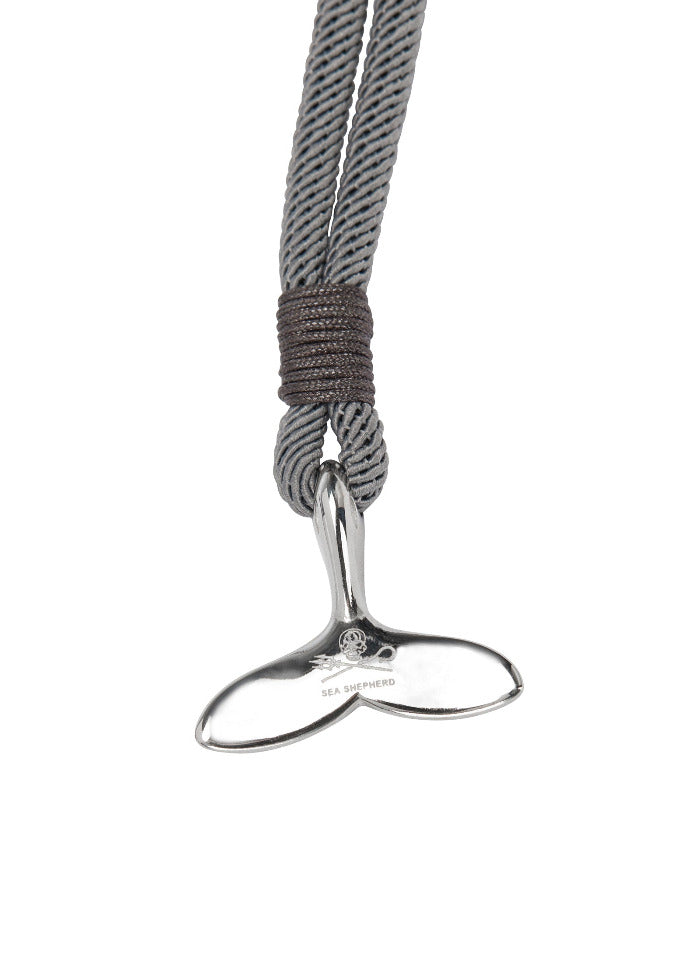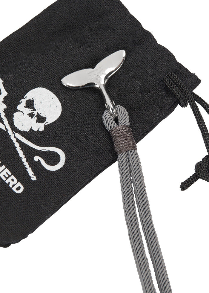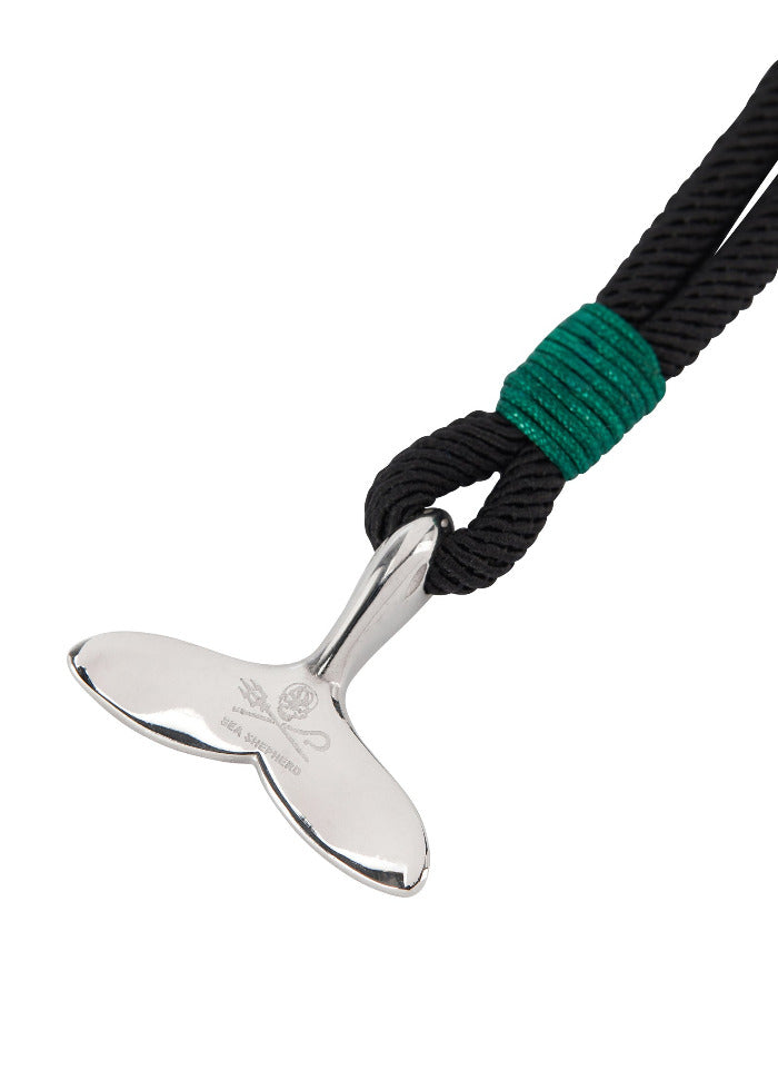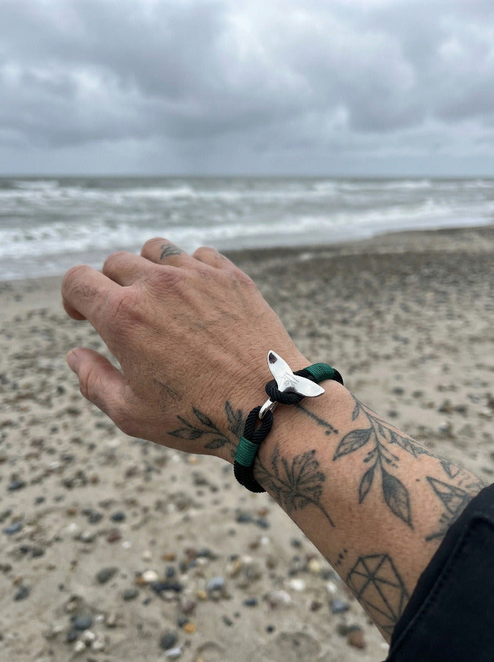Les bracelets sont fabriqués en coton bio de haute qualité et en acier inoxydable poli. Sur la nageoire caudale de baleine se trouve un logo Jolly Roger estampé. Choisis une taille et sélectionne les couleurs noir et gris. Chaque bracelet est livré dans un petit sachet avec le logo imprimé.