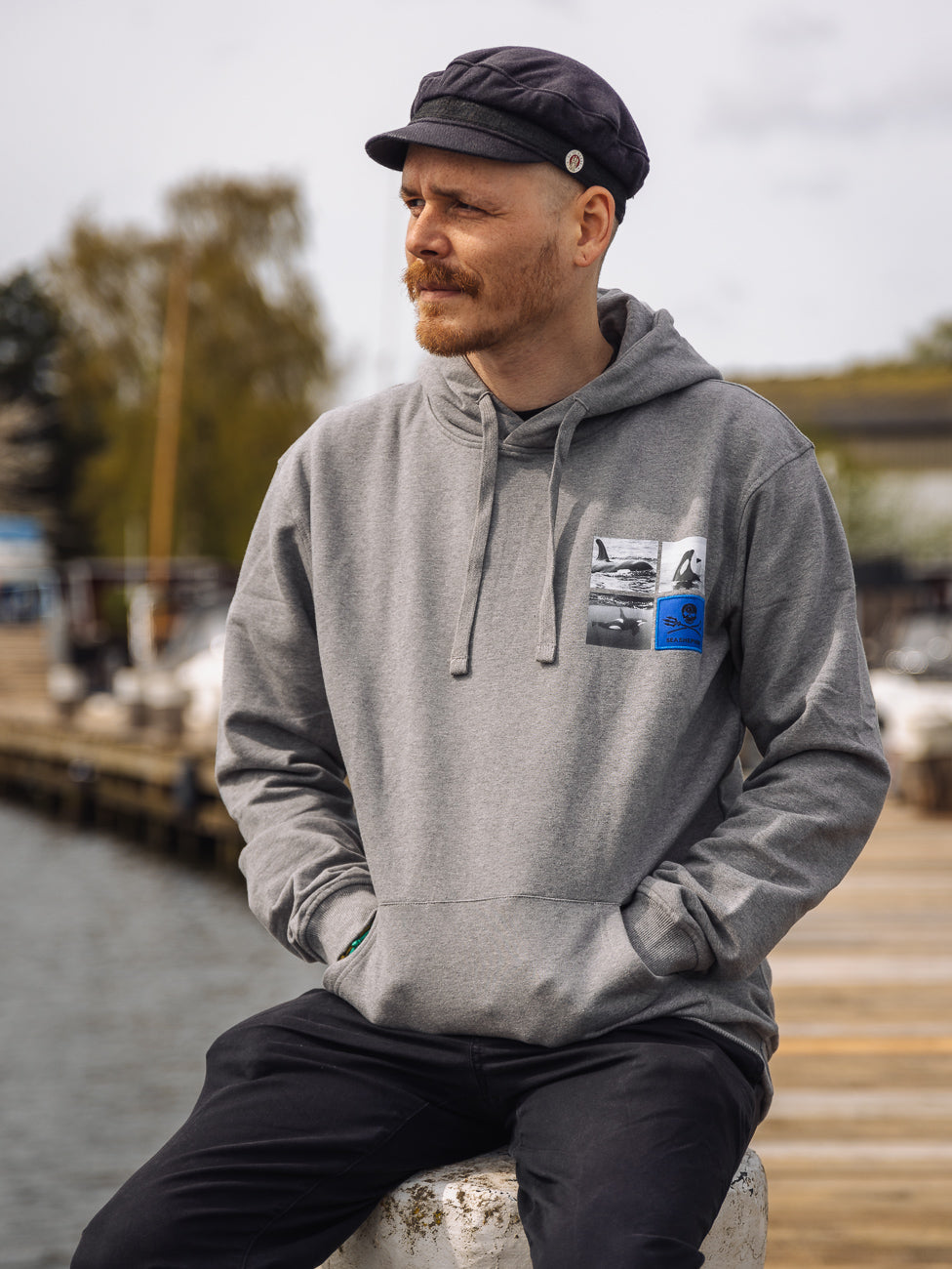 Le sweat à capuche est fabriqué en coton bio de qualité supérieure et est très agréable à porter. Le dos est orné d'une grande photo imprimée et d'une inscription brodée. Trois petites photos imprimées et un patch logo bleu sur la poitrine complètent le design.